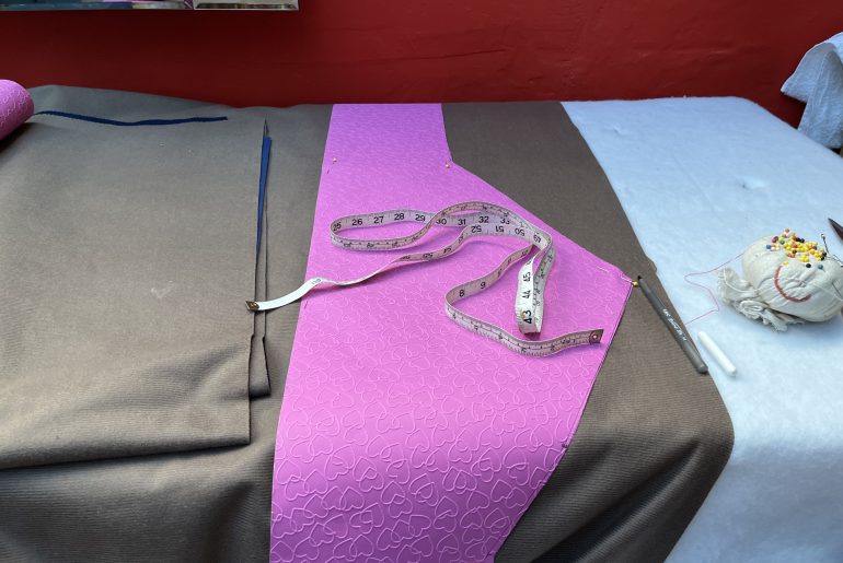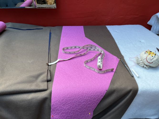I have reached the key Difficult Moment, which is measuring up in order to join the two pieces of fabric with something called a Van Dyke Seam.