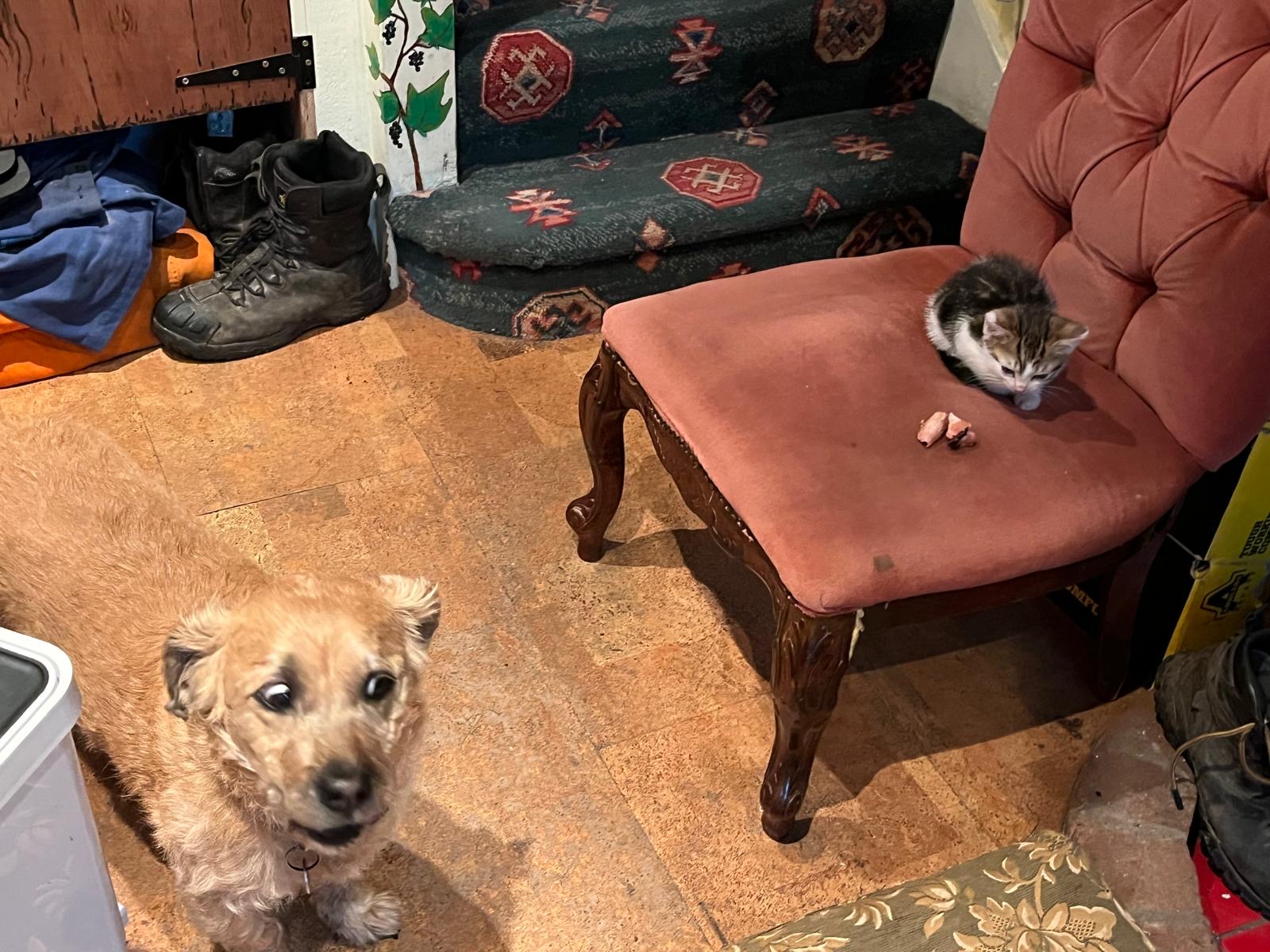Having said that, she is quite remarkably brave. She has not been in the least intimidated by the dogs, although she has made it very plain that they are not to approach, and she is busily laying claim to the best warm places in the house, as again is clear from the picture.