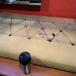 We have, however, been walking, and in between times I have been bashing away at my upholstery project, which is proceeding really slowly. It is slow because I am trying really, really hard not to mess it up, which is a challenge when you don’t have the first idea what you are supposed to be doing. I have glued on some wadding, and made holes in it for the buttons, and now the next challenge is to cut the fabric to size.