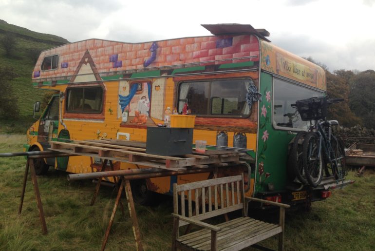 We listened to the silence, broken only by a shouting jackdaw who seemed to be having a disagreement with a hovering kestrel. The morning was grey, and still, and damp, and smelled of fresh grass and sheep. The sheep had come up to investigate the van whilst we had been asleep, and knocked over our bench and left footprints all round the fire. Mark said that this had made the dogs bark, but I hadn’t heard them. Not many interesting things happen to sheep, and I imagine that we were the objects of much curiosity, although it is not easy to guess what sheep might be thinking about.